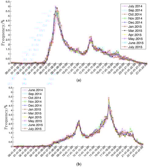 Arrival time and departure time distribution: (a) arrival time; and (b) departure time.