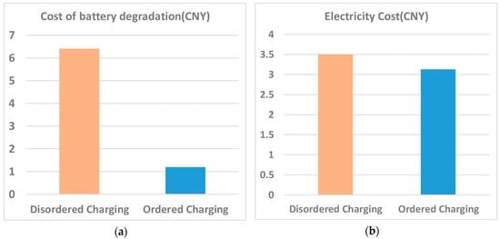 The costs of battery capacity degradation and electricity costs of ordered charging (OC) and disordered charging are calculated and the comparisons of the average values are shown in Figure 7 and Table 2.