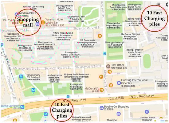 For irregular routes, EV drivers focus more on waiting time since the destinations are always busy areas, such as shopping malls. Therefore, reducing waiting time is given priority by the proposed queuing theory and SOC range planning. Similar to the work done before, 1000 EVs are generated by the MC method with initial SOC, battery capacity, arrival time, dwell time, and distance to the next destination. The data probability distributions are taken from “The US National Household Travel Survey (NHTS)” [34] and organized in [25]. A shopping area with two charging stations nearby is chosen as an example. All the EVs are assumed to be charged by fast charging with a charging power of 30 kW because the drivers have limited time for charging. The geographical placement of the shopping mall and charging stations are shown in Figure 9.