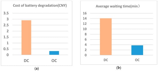 Cost of battery degradation and average waiting time comparison of ordered charging and disordered charging: (a) cost of battery degradation; and (b) average waiting time.