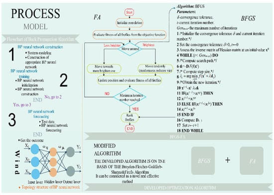 In mathematically simulating the human brain system, the BP algorithm benefits from its underlying processes, fuzzy information processing, and chaotic performance. On account of the error BP algorithm and the multilayer neural network, the BP neural network performs excellently in training ANNs. An input layer, one or more hidden layers, and an output layer constitute a representative BP network. The BP algorithm is always applied to adjust the thresholds, in which the errors from the output are propagated back into the network, transforming the thresholds as it goes, in order to keep the error [46] from emerging again. Its topology and flow structure are as follows: