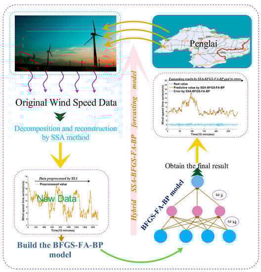 The BP algorithm is selected as the forecasting method to forecast the wind speed time series in this paper. However, because of its unstable structure, we could not obtain more accurate forecasting results with minor error; therefore, it is important to determine the optimal parameters and threshold values of the BP network to promote the predictive effectiveness. BFGF-FA is proposed to determine the weight and threshold. In addition, large amounts of noise present in the original wind sequence will lead to a poor forecasting performance. Therefore, we choose the SSA to remove the noise from the raw time sequence. The corresponding basic procedures are presented as follows, and are depicted in Figure 2.
