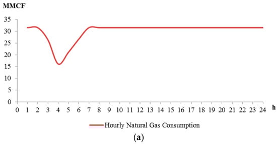 In scenario (1), the GT units’ functions as low-cost generating units and as peak/reserve units will conflict due to their limited capacities. When GT units are taken as reserve providers, one way to guarantee the sufficient reserve capacity is to keep a certain number of GT units from the energy commitment. The probabilities of risk with different numbers of reserved GT units are shown in Table 3. It can be found that the probability of risk decreases as the number of reserved GT units increases. The probabilities of health with various number of reserved GT units are shown in Table 4. From Table 3, it can be found that, regardless of the number of reserve units, the risk probabilities are distinct at some moments, especially for hour 6. This is because the specific energy production and consumption conditions at hour 6 make the unit commitment at that moment different from at other hours. From Figure 5a, the residential natural gas consumption rebounds after hour 5 and the bounce rate is the highest at hour 6, which indicates that the committed GT units are likely to shut down so that the natural gas consumption of the residential load can be guaranteed. However, they are still able to provide reserve services under the contingency offers if there is a reserve gap threatening the system’s well-being. At the same time, more conventional units will be committed as the electric load is also going to rise according to Figure 5b, which strengthens the total reserve capacity of the system. Thus, the risk metric is considerably lowered at hour 6 due to the start-up of plentiful conventional units, large reserve capacities provided by GT units, and the relatively low load level. However, this does not indicate that the reserve is unnecessary at hour 6. In fact, the health metric at hour 6 does not meet the requirement unless five GT units are providing reserve services. In general, the abnormal probability value at hour 6 is an occasional event that is the result of many factors and cannot guarantee the well-being performance even for minor fluctuations. In scenario (1), the qTC constraint does not affect the WBA results, which indicates that the fuel scarcity and transmission constraints will not influence the operation of GT units when the installation proportion of GT units is low and the interconnections between the electric power and the natural gas system are loose.