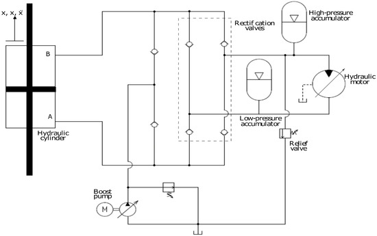 Several topologies of hydraulic system have been suggested for wave energy converters in the literature. The most simple hydraulic transmission systems include a hydraulic cylinder, high- and low-pressure accumulators, a rectification bridge and a fixed-displacement hydraulic motor, as suggested in several studies, such as the W2W models presented in [7,16,17,18], and also in [19], where a W2W model for arrays is proposed.