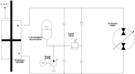 The system shown in Figure 3 is close to the simplest version of a variable-pressure configuration. Similar configurations have been suggested in [20,21], including an energy overflow system connected to the relief valves. That way, when the cylinder produces more flow than the hydraulic motor can handle, the extra flow can be used to generate electricity, instead of leaking it to the LP accumulator, wasting energy contained in the HP fluid.