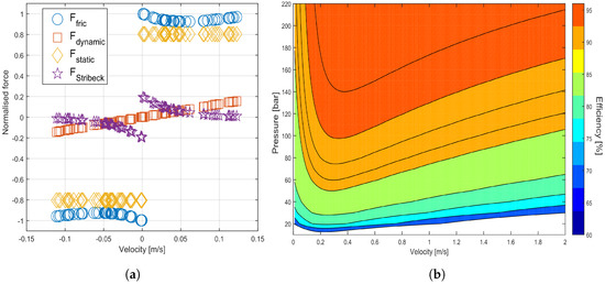 Friction losses in the hydraulic cylinder: (a) the impact of different friction effects normalised against the maximum friction force; and (b) the approximated efficiency map of a cylinder, reproduced from [20].