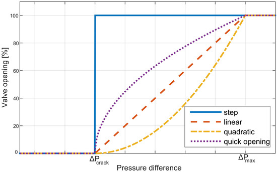 Only passive valves, check valves in the rectification bridge and relief valves are used in the present study, which open and close as a function of the pressure difference across the valve, as expressed in Equation (6). The valve remains closed while the pressure difference across the valve is lower than the cracking pressure (). Once the the cracking pressure is reached, the valve starts to open and continues opening until the valve is fully open. The pressure at which the valve is fully open is known as the maximum pressure (). Hence, maximum area of the valve, and cracking and maximum pressure are, in general, provided in the manufacturers’ catalogues. However, the valve opening, from fully closed to fully open, can follow different profiles. Some of the most commonly observed profiles [29] are illustrated in Figure 5. In the model validated in this paper, the step function is implemented to reproduce the same valve opening profile as in the original study, where the experimental data is taken from [30].