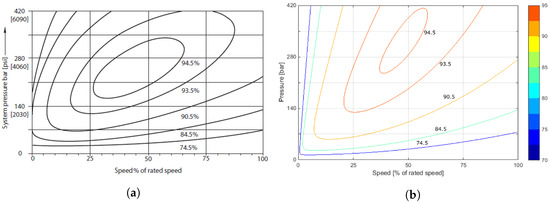 Equations (11) and (12) describe the Schlösser model. Model parameters (, , , and ) are identified, in this case, using the data from manufacturers for the Sauer-Danfoss 250 cc Series 51-1 bent-axis motor (Ames, IA, USA) [38], which includes efficiency data for two specific cases, i.e., full-displacement () and partial-displacement (). Figure 6a illustrates the efficiency map provided by the manufacturers and Figure 6b shows the efficiency map obtained using the fitted model, both for the full-displacement condition.