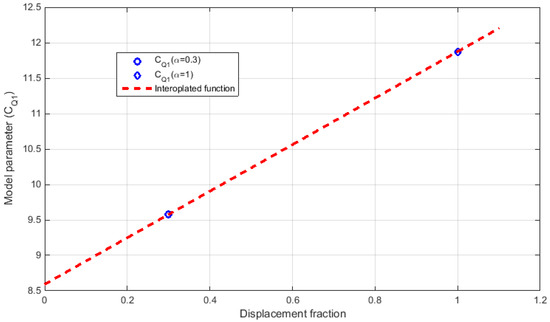 The linear least square fitting approach is used to identify the parameters of the models for each case, and once all the parameters for both cases are identified, coefficients can be expressed as a function of the displacement fraction () using linear interpolation between the two coefficients, as shown in Figure 7 for the coefficient . Linear interpolation is convenient to obtain the parameters of the loss model at different operating points, since manufacturers’ only provide the data for two operating points, but it should be noted that the real behaviour of the motor is not expected to be linear.