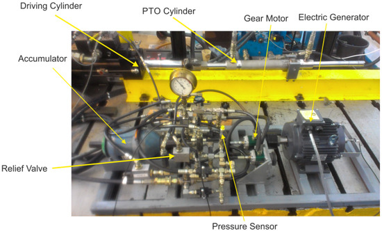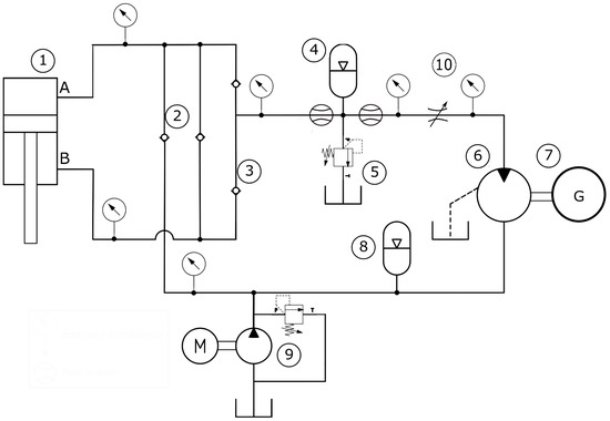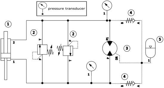 The hydraulic circuit used to validate the variable pressure configuration also used a fixed displacement motor, rather than the variable displacement motor shown in Figure 3. The leakage from the motor is directly returned to the circuit via an accumulator and a pair of check valves, obviating the need for a boost pump. Pressure signals are measured by means of pressure sensors from the Parker ASIC series (Cleveland, OH, USA) rated to 250 bar, which are calibrated at manufacture. Figure 10 shows the complete hydraulic circuit and Table 2 shows the details of each component.
