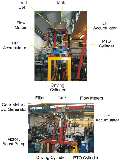 The mathematical models for the two configurations are significantly different, thus requiring separate validation. Therefore, experimental data, generated by using two different test-rigs, are used in the validation. The performance of the hydraulic cylinder for both hydraulic system configurations is validated against experimental results, while the well-known simulation software AMESim (v14.1, LMS/Siemens PLM Software, Leuven, Belgium) [26] is used to validate the performance of the hydraulic motor, due to the lack of experimental results for the hydraulic motor.