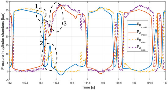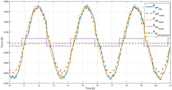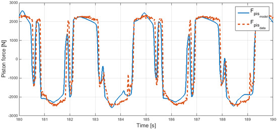 Results of the hydraulic cylinder show very good agreement for pressure and force values in the different test cases analysed for the two configurations. In the constant-pressure configuration, the effect of the rectification valves is well reproduced by the mathematical model, including the pressure and force oscillations that arise when the piston approaches its final position. In addition, the mathematical model shows the ability to capture the asymmetry observed in the variable-pressure configuration experiments and demonstrates the effectiveness of the friction model, reproducing the effect of the static friction at low velocities.