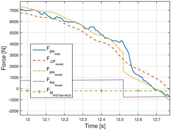 The friction model presented in this section assumes friction losses are symmetric, as shown in Figure 4a. However, this is not always true, especially in asymmetric cylinders. In some cases, a lag exists between the pushing (positive velocity) and retracting (negative velocity) forces. To include such asymmetry, the model structure presented in Equation (5) is still useful, but needs to be duplicated to distinguish the performance during the pushing and retracting operations, separately identifying the parameters for each operation [28].