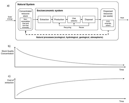 (a) The open cycle cradle to grave economy; (b) Reduction of resource stock quality due to open cycles; (c) The cost of extracting successive units of stock in line with the law of diminishing returns.