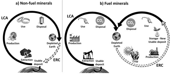 ERC scope of non-fuel minerals (based on the theory presented in [6]) and fossil fuels minerals. Note: Using the non-fuel mineral method for fuels does not permit the closure of the energy and material cycle, and so the ERC cannot be calculated unless the alternative (bio-energy) pathway is employed. Adapted from [8]