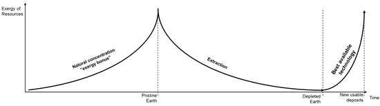 Whilst the EROI is used to quantitatively evaluate the effort, or energy, needed to obtain one unit of fossil fuel, the ERC goes one step further by calculating how much exergy would have to be invested to re-concentrate that which has been extracted and dispersed throughout time, back into a manmade usable deposit, relative to a theoretical “Depleted Earth” here abiotic resources are present in a completely dispersed state (i.e., no mineral deposits exist). The difference between Thanatia and a “Depleted Earth” is conceptual and subtle. The former considers the depleted planet to be one where no viable resources can be extracted. The latter states that there are no deposits, regardless of viability, which is a necessary assumption to undertake the exergy analysis. The reference state upon which the calculations are framed is the same. The application of the method is thus not affected. Figure 3 shows the theoretical evolution of mineral resources in terms of exergy. The “Pristine Earth” represents an Earth that has a bounty of exergy reserves because they have been built up over time and have not been extracted. As society develops extraction occurs and the exergy available to each successive generation reduces until the Earth’s exergy stock becomes excessively depleted and no viable deposits are left. This situation is depicted in the section of the graph labelled “Depleted Earth”. At this point exergy stocks are low but do not reach zero (exhausted Earth). Further, societal development is only possible once best available technologies re-establish the stock through the creation of new manmade deposits.