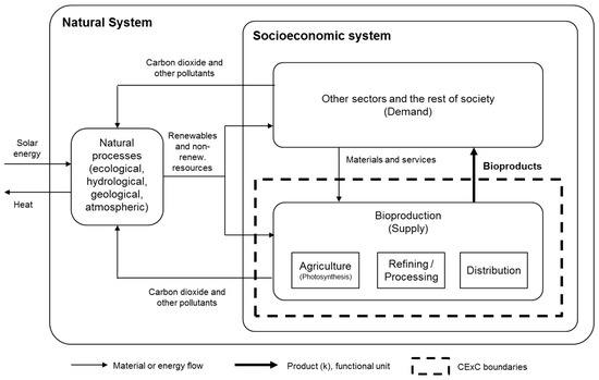 In the combustion process between 80 to 99 percent of the air emissions is carbon dioxide in mass terms, excluding water vapour [66,67]. Other types of contaminants, principally carbon monoxide, nitrous oxide, sulphur dioxide, volatile organic compounds and particular matter are also released, but it is beyond the scope of this study to calculate how much exergy is required to reincorporate them back into a useful input for the economy. Thus, CO2 is the only input derived from combustion that we feed back into the bioproduction process. The energy and material inputs from supporting sectors (e.g., that used in the raw material extraction of phosphate for fertilizers, electricity, etc.) and in the treatment of emissions released to the environment are also considered.
