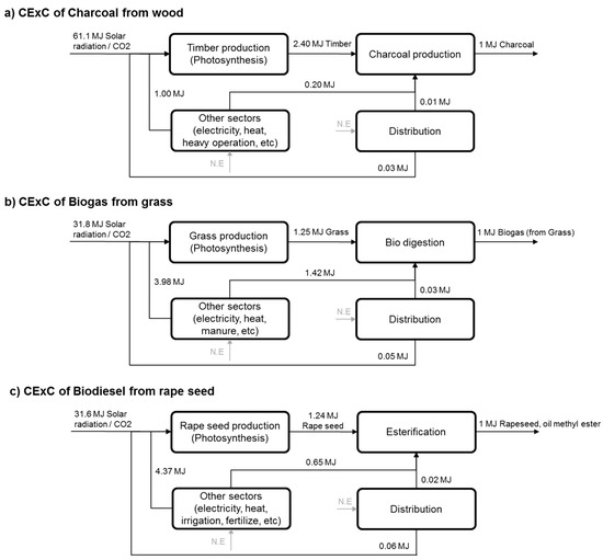 Example of CExC calculations for charcoal, biogas from grass and biodiesel from rapeseed.