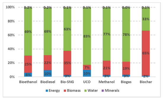 Resource contributions to the exergy cost of bioproducts (crop to fuel). Note: For biogas production only biomass derived from crops (and not waste, for example) were taken into consideration.