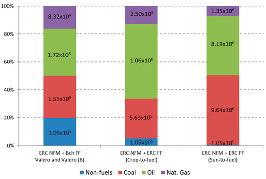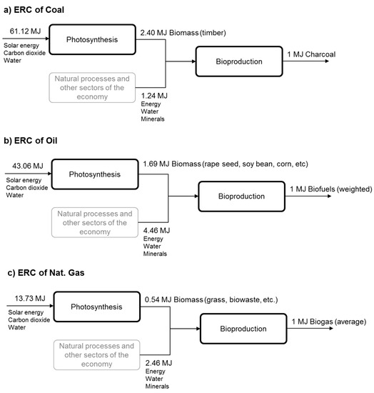 Table 3 shows the exergy consumed by Nature and society to obtain 1 MJ equivalent of fuel. This exergy cost takes into account the entire life cycle from “solar radiation to fuel”. From solar radiation to biomass is the “photosynthesis” stage, while from biomass to fuel is the “bioproduction” stage (Figure 7). The ERC of oil expresses the weighted exergy cost of all the bioproducts that correspond to the fractions that constitute a barrel of oil. Natural gas’ ERC is associated with the exergy cost of biogas. Coal’s ERC corresponds to that of biochar. The total ERC value presented in Table 3 is the sum of the exergy cost of photosynthesis with the exergy cost of energy, minerals and water (Figure 7).