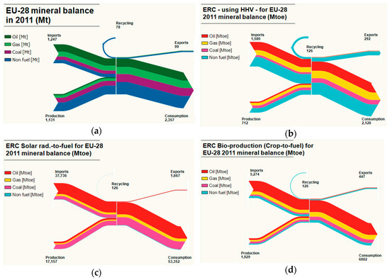 Calvo et al.’s. [14] European Union (EU-28) case study results are presented in the form of a Sankey diagram (Figure 9a,b). In their paper, the ERC is approximated using the HHV because fuel minerals, under the original theory, are non-substitutable. The problem is that under this assumption the real exergy cost of fuels would be infinite and not 0.76, as they suggest.