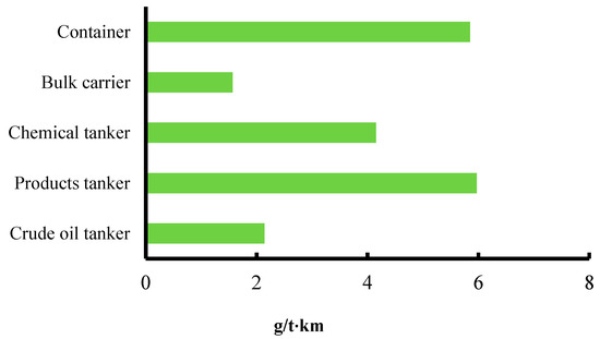 Figure 1 shows the significant variances among the energy efficiencies of the major vessel types. Due to their high average speed and load capacity but smaller average size, the energy intensities of products tanker and container vessels are expected to approach 6 g/tonne·km, which is around three times and four times of that of crude oil tanker and bulk carrier vessels, respectively. When the energy efficiency development is assessed, it is expected to take into account improvements in technology, changes in the size of the ships, and market-driven reductions in fleet speed [44].