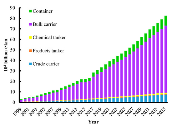 Based on Equation (4), the Log-linear regressions of each scenario were calculated using the SPSS software. All of the five categories: crude oil tanker, products tanker, chemical tanker, bulk carrier, container, and their dependent variables of transport turnover volumes were described as linking closely to variable of GDP. The coefficients of correlation (r2) of the five models are 0.967, 0.802, 0.895, 0.980 and 0.907, respectively. Taking the model of the crude oil tanker as an example, the result implies that from 1999 to 2016, the GDP of China can explain the relative majority (96.7%) of the variability in the transport demands of crude tankers. The relationship between the transport demand of the product tanker and GDP is not as strong as the other four categories, since it has the lowest coefficient (0.802), which can be considered to be a rational result greater than 0.8. Figure 2 presents the historical transport turnover volume from 1999 to 2016, as well as the projection through 2035 based on Equation (4).