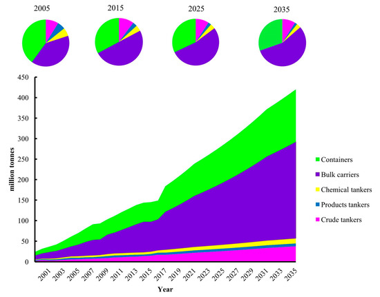Figure 3 presents the future projection of CO2 emissions in the China-oriented international seaborne trade sector. Generally, aggregated CO2 emissions are predicted to increase at an average annual growth rate of 8.3% and to reach 419.97 Mt in 2035, which is nearly 4.5 times that of 2007. Specifically, the increasing rate of the aggregated CO2 emissions is projected to be 13.4%, 7.2% and 4.7% during each decade after 2000, respectively. Due to the estimated slowdown in economic growth after 2030, the growth rate of the CO2 emissions is projected to decrease to 3.4% from 2030 to 2035. As shown in Figure 3, CO2 emissions from China-oriented international seaborne trade had higher growth rates according to the historical data, and they might increase considerably over the long term, driven largely by a booming economy and globalization of trade.