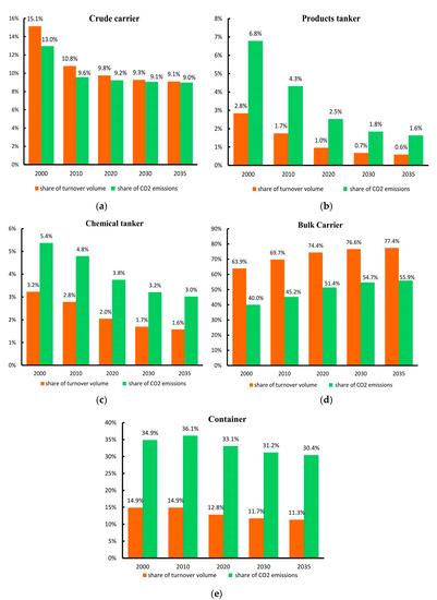 A comparison of the proportions of the transport turnover volume and CO2 emissions between 2000 and 2035. (a) Crude oil carrier; (b) Products tanker; (c) Chemical tanker; (d) Bulk carrier; (e) Container.