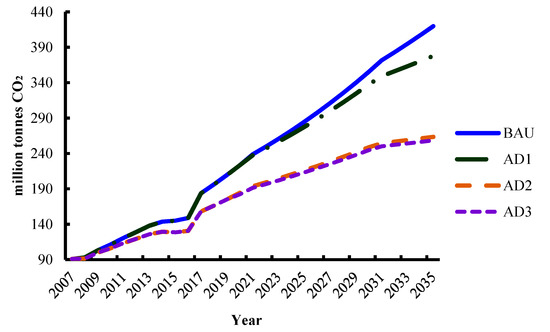 As shown in Table 3, four alternative scenarios were developed in this study, based on the multiple projections of scenarios for key factors presented in Section 3. When all of the inputs and policies continue their current development trends, these inputs constitute the BAU scenario of the CO2 emissions trend. Three alternative scenarios were also established considering convergence and mitigation. Accelerated development scenarios (AD) describe worlds that have the advantages of rapid improvement in transport infrastructure, technology and cleaner energy, as presented in Table 3. In this study, AD1, AD2 and AD3 present accelerated development situations to varying degrees.