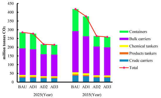 A breakdown of CO2 emissions of each category in 2025 and 2035 under the various scenarios is presented in Figure 7. In the short-term future of 2025, the CO2 emissions of the five categories under the ADs scenarios will not decrease significantly due to moderate mitigation of the specific inputs. In the long-term future of 2035, bulk carrier vessels will contribute the most to the overall CO2 emissions reduction. From the BAU scenario to the AD3 scenario, CO2 emissions produced by bulk carrier vessels are reduced by 74.23 Mt, accounting for 46% of the overall reduction.