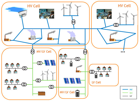 Compared with other architectural approaches, such as microgrids [5,6,7,8], which is perhaps the most widely accepted, mature and well-established concept for hosting large amounts of distributed RES, in terms of DER integration, the cell concept presents some advantages such as more generic voltage level applicability (whilst microgrids are confined mainly to LV distribution grids), more than one connection (tie-line) to other cells at any voltage level, or no self-sufficiency in terms of energy balance which means that a cell can largely rely on imports/exports, etc. On top of that, cells ensure their provision of reserves that serve primarily their own stability whilst microgrids, when in grid-connected mode, act rather as aggregators providing ancillary services to DSOs. However, by no means should cells be considered as a substitute of microgrids, since both architectures can coexist in a power system.