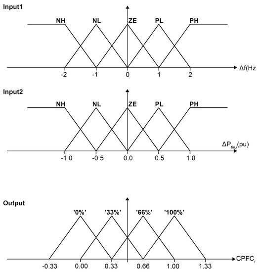 The sum in Equation (2) represents the individual contribution of each adjacent cell j to the tie-line error in cell i. The premise of this approach is that when an imbalance incident happens in one cell, the frequency initially increases/decreases based on the imbalance sign and, by the same token, and based on the sign convention for the power production/consumption, the tie-line error aggregate follows an opposite-to-the-frequency course, i.e., the tie-line error increases when frequency decreases. Thus, by detecting the combination of signs as well as sizes of the two errors, it is possible to adjust the droop slope of the cell when the incident takes place outside the cell or maintain its maximum value when the incident concerns the specific cell. The membership functions of the selected controller are depicted in Figure 3. In this exemplary approach, the input and output signals consist of triangular functions. The maximum frequency range is from 48 to 52 Hz (±2 Hz) and the maximum tie-line error varies from −1 to +1 pu. However, these limits are easily adjustable by means of the gains g1 and g2 in the input signals. In any case, the output CPFCr consists of four membership functions which produce a gradual CPFC reduction from 100% to 0%.
