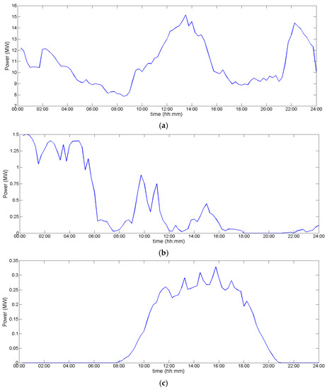 Input data used for the 24 h tests: (a) Load profile; (b) Wind generation profile; (c) photo voltaics (PV) generation profile.
