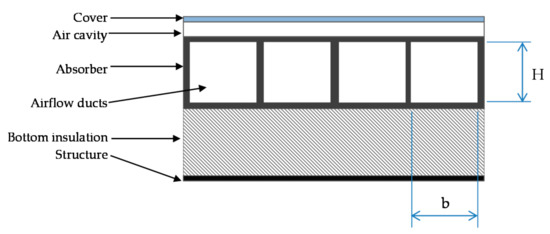 Two collectors of the above-mentioned type, from the manufacturer Grammer Solar S.L. (Valencia, Spain), were connected in series. A schematic view of the cross-section and dimensions of the studied SAH are shown in Figure 1 and specified in Table 1.