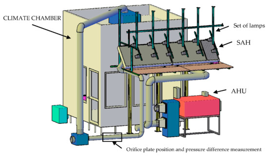 The SAHs were mounted on the experimental setup illustrated in Figure 2 and characterised taking into consideration the current standards [34]. Solar radiation is reproduced through a set of lamps, whereas outdoor air conditions are reproduced through an Air Handling Unit (AHU) equipped with the required filters and variable frequency drive fan system. Air heated in the SAH is then driven to a climate chamber. All elements are connected with flexible and PVC ducts of 20 cm diameter previously checked to avoid leaks.