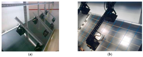 Lamps installed are halogen bulbs that provide 75% IR radiation, 5.75% visible radiation, and 0.25% ultraviolet; the remaining energy is dissipated through conduction and convection [35]. The setup consists of 12 lamps of 500 W each, placed uniformly in two rows at a distance of 0.5 m to the SAHs. Before developing the experimental tests, that irradiation achievable with all or alternate lamps being turned on is characterised by measurement with a pyranometer. It was placed on the surface of the two collectors connected in series and moved to different positions according to a rectangular grid. The measuring range covered by the pyranometer used, which corresponds to the model FLA628S from Ahlborn Equipment, Inc. (supplier: Electroson Castilla S.A., Valladolid, Spain), is 0 W/m2 to 1500 W/m2 and its accuracy is ±7%. Figure 3 shows the setup of the lamps and the measuring procedure.