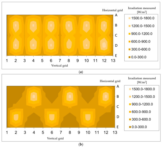 The points of the grid and the levels of irradiation measured are shown in Figure 4 for both cases considered. Irradiation measured in node 12-B exceeded the range of the pyranometer and was considered with care.