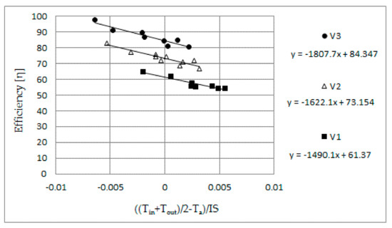 The developed design of experiments yielded three airflow levels (V1 = 100 m3/h, V2 = 200 m3/h and V3 = 300 m3/h) and four inlet air temperature levels (T1 = 0 °C, T2 = 5 °C, T3 = 10 °C, and T4 = 15 °C), which corresponds to the ambient air temperature (Ta) in the real operation of the system. Ambient temperature in the laboratory where the tests were performed was 21 °C. The experimental setup, described previously in Section 2.1, allowed two irradiance levels to be studied: 828.4 W/m2 and 447.9 W/m2. This resulted into 24 tests. Table 2 compiles the obtained experimental results. The efficiency versus the relation between ambient air temperature Ta and irradiation I (W/m2) is represented in Figure 5.