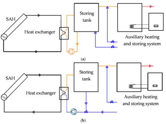 To model the behaviour of both configurations shown in Figure 6, each subsystem needs to be characterised. Here, the main criteria for the modelling of the heat exchanger, the first water tank (fed directly by the heat exchanger), and the SAH are presented.
