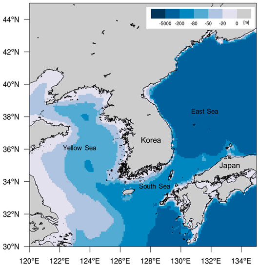 To construct and evaluate an offshore wind speed forecasting model as a function of sea surface temperature, remotely sensed surface observations—such as sea surface temperature and offshore wind speed—were utilized in this study. Satellite data were collected to overcome the limitations of the space range offshore where measurement data were hard to acquire. The seas surrounding Korea are divided into the Yellow Sea, East Sea, and South Sea according to their geospatial locations as shown in Figure 1. Each sea has a significantly different bathymetry (depth in meters). The depth of the Yellow Sea is mostly less than 80 m, whereas that of the South Sea is less than 80 m near the coast and around 200 m offshore. The East Sea has an average depth of 1700 meters, although it can be as deep as 5000 meters in places, which makes it a deep sea. Thus, most areas of the Yellow Sea and South Sea are 80 meters deep near the coast, except for the deep-sea area of the East Sea. This means that the characteristics of wind conditions differ regionally due to the air-sea climate interaction. Thus, spatially variable sea surface temperatures and winds were used for ten years because they were typical thermal and dynamical variables in the surface between the sea and the atmosphere.