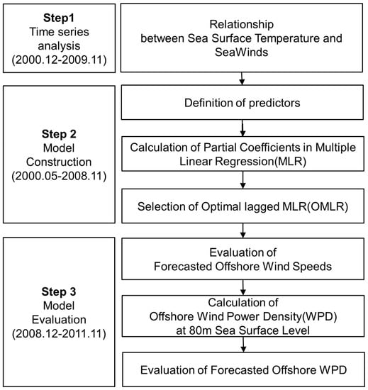 The schematic diagram of wind speed forecasting is shown in Figure 2. The process of constructing the model was largely divided into three phases: time-series analysis, model construction, and model evaluation. The analyzed data and the period for each phase were slightly different. Time-series analysis was conducted on the period from December 1999 to November 2009, which is the longest record of QSCAT wind speeds. Afterward, the model was developed using the data from May 2000 to November 2008. This period is the so-called training or fitting period, which is used in the development of the forecasting model-based on the empirical statistical method. Finally, the model was evaluated for the remaining period from December 2008 to November 2011.