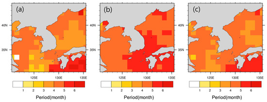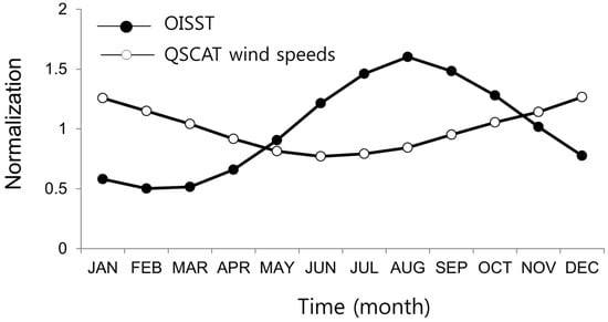 In this section, the spatio-temporal relationship between the predictor and the dependent variables, which are required to construct a statistical wind speed forecasting model, was analyzed. Figure 3 shows the monthly variability of the spatial averaged OISST and QSCAT wind speeds for the time-series analysis period. The OISST and QSCAT wind speeds showed a negative correlation. This result is known to be a common feature caused by the air-sea interaction in the mid-latitude [36]. A strong QSCAT wind occurred at a speed of 8.81 m/s from December to January (winter). During the period from May to August (summer), the wind speed weakened to 4.91 m/s. On the other hand, the OISST was 8.93 °C and 24.80 °C in February and August, respectively, which were the lowest and highest values recorded during the year. These seasonal variations were also represented in the power spectrum, as shown in Figure 4. The OISST and QSCAT wind speeds showed nearly the same dominant periodicity, reaching a peak in three months. Note that there were some out-of-phase delays between the monthly OISST and QSCAT wind speeds.