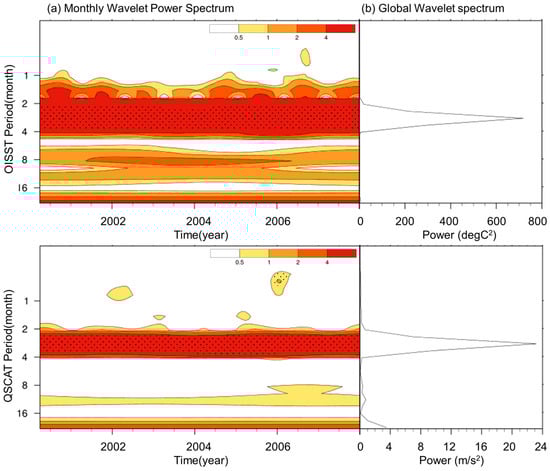 Spectral analysis of OISST and QSCAT wind speed during the same analysis period. The hatched area in the wavelet spectrum represents significant energy at a 95% confidence level.