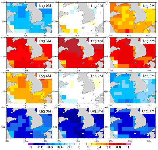 In order to establish a wind speed forecasting model as a function of the mixed periodicities of sea surface temperature, proper mixed periodicities were extracted based on the autocorrelation of the OISST and QSCAT wind speeds during the fitting period. Here, monthly sea surface temperatures corresponding to time lags become predictors in the MLR equation. Figure 6 shows the spatial patterns of the autocorrelation coefficient (CC) with regard to the OISST and QSCAT wind speeds. Time lags with CC values of over 0.6 were three to five months or nine to eleven months. The forecast lead times of the OISST, which can estimate the wind speeds, ranged from one to six months, showing positive CCs. The CC for the one-month lead time (lag 1 M in Figure 6) varied in the range of −0.2 to 0.2, wherein the OISST was not correlated with the wind speed. The OISST at two- and six-month lead time (lags 2 M and 6 M in Figure 6) showed CCs with normal values of 0.3 to 0.4. Although relatively low CCs (0.2–0.4) were observed in a part of the Yellow Sea near the coast of the Korean Peninsula, the OISST at three- to five-month lead time (lag 3 M to 5 M in Figure 6) revealed high CCs with wind speeds of 0.6 or higher over most of the study area. Thus, proper lags were within a range of two- to six-month lead time, whose correlation was 0.4 or higher, and the OISST in those time lags was applied as the predictor in potential wind speed forecasting models.