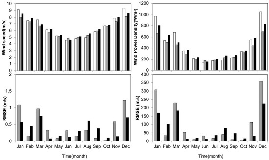 The proposed OMLR was evaluated in terms of not only wind speed but also WPD by satellite observations and a seasonally varying climatology for the model evaluation period. In particular, WPD was applied to investigate the use of the OMLR for wind power forecasting. The persistence model has been used frequently to compare the statistical model as a reference in previous studies. Figure 7 shows the monthly variability of the spatially averaged wind speeds and the WPD over the study area. The monthly wind speeds estimated by the climatology and the OMLR expressed the monthly variability of the measured wind speeds well. The slowest and strongest wind speeds were observed in June and December. Moreover, the climatology and the OMLR underestimated the wind speeds by 66% and 25%, of the months of the total years, particularly for winter seasons. RMSE values were 0.45 m/s and 0.37 m/s for the climatology and the OMLR, respectively. The OMLR showed better performance during winter seasons, when the wind speed is pronounced. The monthly variations in the WPD were large compared with those of the wind speed at 10 m asl. When this was compared with that of the WPD at 80 m asl, the RMSE even exceeded 150 W/m2 in some cases. The WPD taken from the OMLR showed a relatively smaller RMSE than that taken from the climatology. The OMLR revealed up to 137.56 W/m2 RMSE compensation compared to that in the climatology, implying that about two grade differences can result according to the WPD. Overall, the OMLR exhibited a better predictive performance than the climatology.
