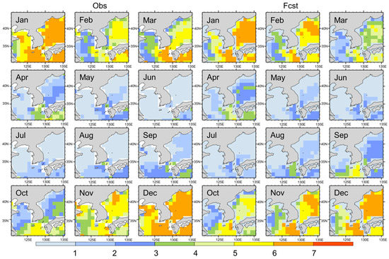 In order to validate the performance for the model for forecasting spatio-temporal offshore wind power, the spatially variable WPD was also compared. Figure 8 illustrates the spatial distribution of monthly variability in terms of WPD grade. The observed WPD grades in most of the regions were higher than Grade 3 (250–375 W/m2), except from June to July. In the summer season (June to August), while WPD grades lower than Grade 3 were noted throughout the regions. WPD grades higher than Grade 3 were pronounced in the winter season (November to March) over most of the regions. Although the hindcast WPD grades were somewhat overestimated in the regions and months, the spatial characteristics of the WPD grades between the OMLR and the observation were quite similar.