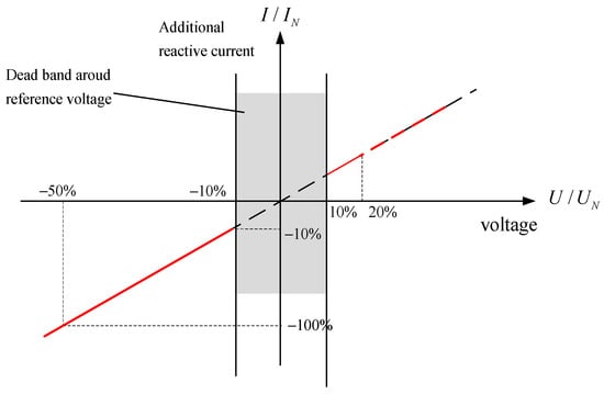 According to E.ON’s grid connection requirements [4], when voltage has fallen more than 10%, the wind power system has to provide 2% of the rated current for each percent of the voltage dip. A reactive power output of at least 100% of rated current must be possible if necessary, as shown in Figure 3.