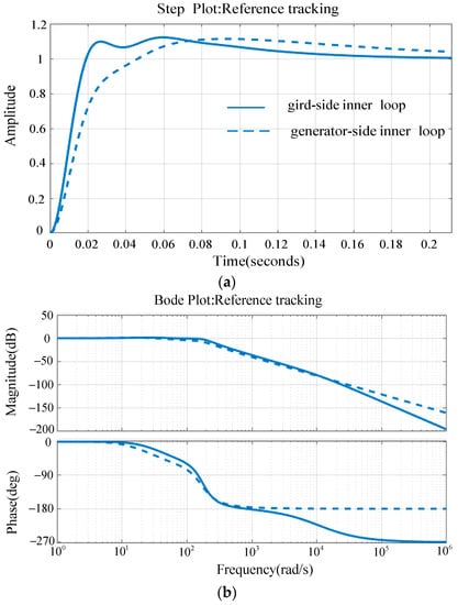 Although the DC-link voltage control outer loop interconnect with both the grid-side d-axis current control loop and the generator-side converter q-axis current control loop, the two currents are not really connected to the DC-link voltage outer loop at the same time. Only the grid-side d-axis current references reach the upper limit; the generator-side q-axis current attend to the DC-link voltage control. Then, the outer DC-link PI controller design needs to consider the grid-side inner loop or generator-side inner loop, respectively, and obtains the parameters with the trade-off of the two different inner loops. Fortunately, the dynamic characteristics of the grid-side inner loop and generator-side inner loop are similar if carefully tuned with the PI controller parameters; then it is not difficult to get the DC-link outer loop control parameters. Given that the frequency domain index approximates the bandwidth = 50 dB and the phase margin = 50°, the DC-link voltage PI control parameters are obtained and shown in Table 1. The Bode plots and step response curves of the simplified systems with different inner current loops are shown in Figure 5.