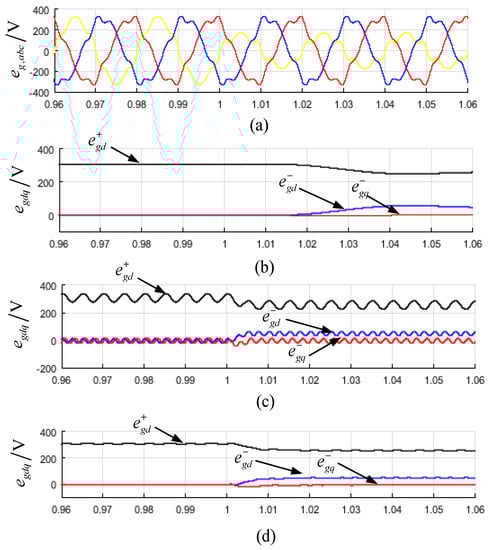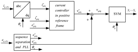 Additionally, negative-sequence voltage feed-forward is adopted in the paper because of its simplicity. The control block diagram of VCCF is shown in Figure 6. The current controller is implemented in the positive-sequence frame, while the negative-sequence grid voltage is the feed-forward component added to the current control output. The grid-side converter will output the same negative-sequence voltage as the grid voltage, . According to Equation (18), when the system is stable, only positive-sequence currents flow to the grid.